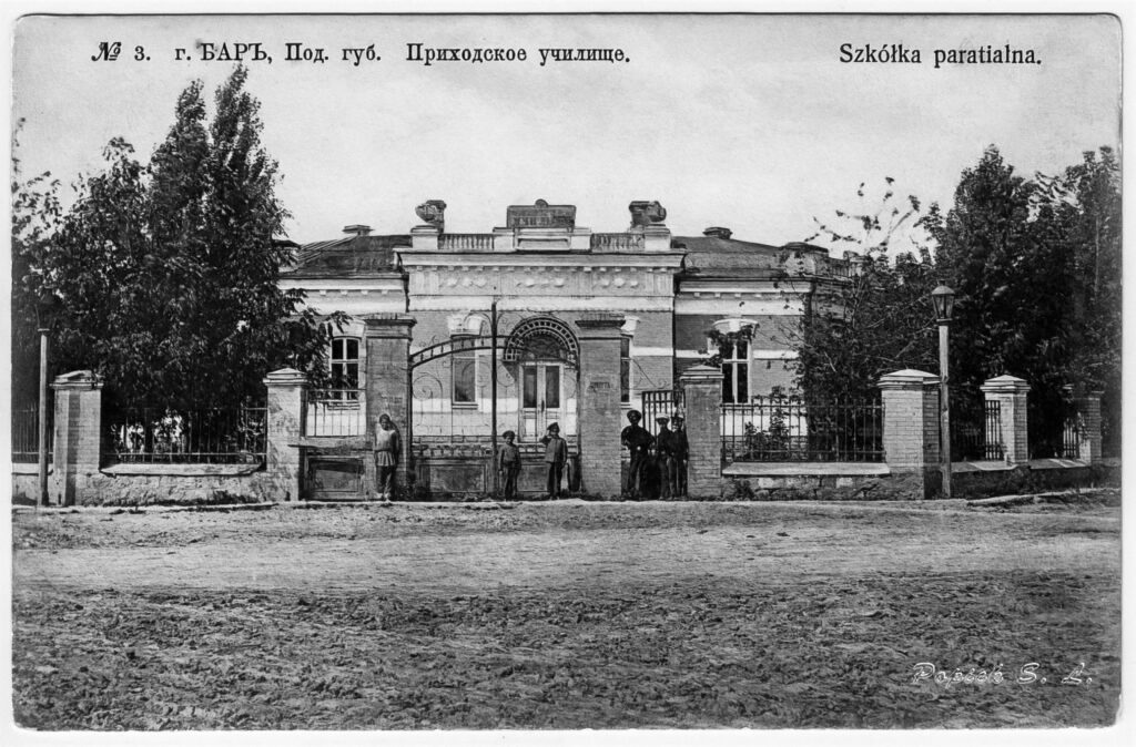 На старій світлині видно напис «Приходське училище». У різні роки це приміщення слугувало: народним училищем, ПТУ №8, навчальними класами школи №2, спортзалою Барського машинобудівного заводу, казначейством, методкабінетом. Уже кілька десятиліть будівля стоїть пусткою. Арочні входи та будівельні декоративні елементи над вікнами нагадують про архітектурну вишуканість минулого.