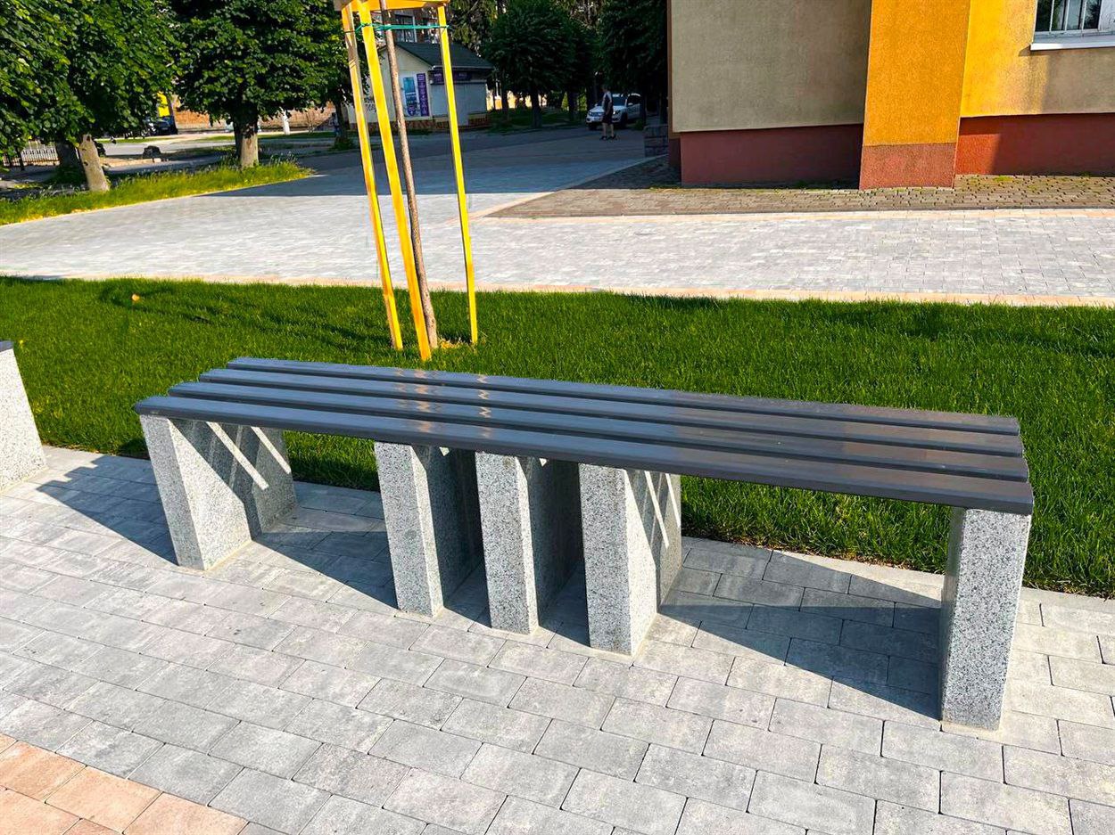 Лавки розміщено вздовж пішохідної зони, поруч із будівлею бібліотеки. Вони мають бетонні або гранітні основи та сидіння з композитних матеріалів — практичних і довговічних. Такий дизайн гармонійно поєднується з новою тротуарною плиткою, молодими деревами катальпи та свіжим рулонним газоном, якими нещодавно озеленили територію.