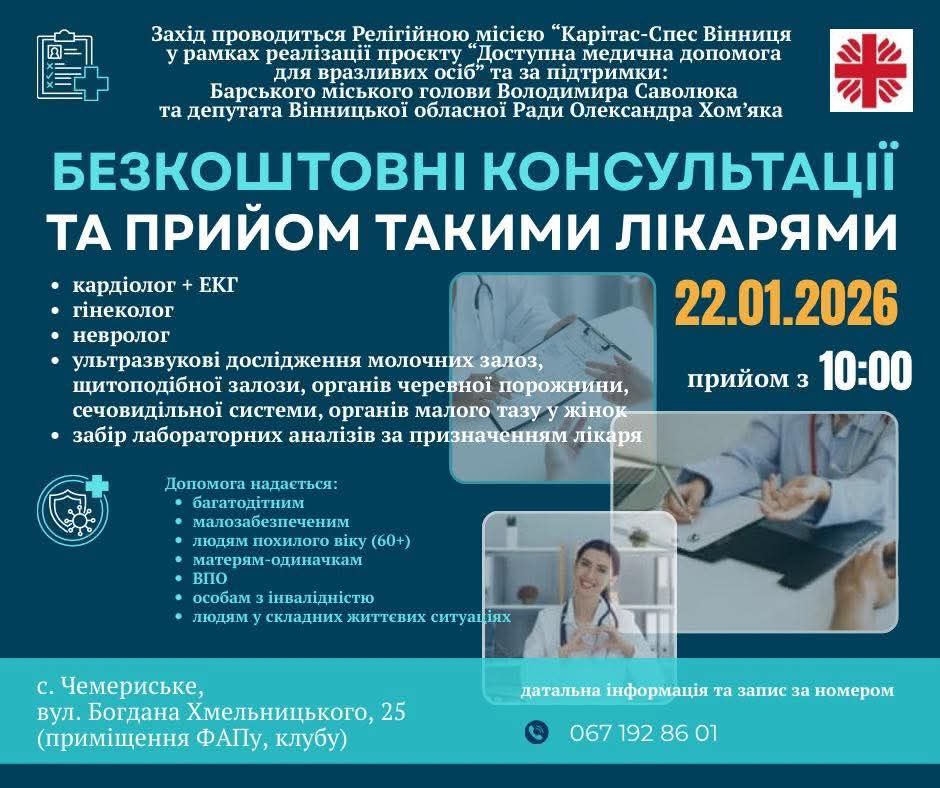22 січня 2026 року у Чемериському старостинському окрузі відбудеться благодійний виїзний прийом лікарів для мешканців соціально вразливих категорій. Захід покликаний забезпечити доступ до медичної допомоги для тих, хто потребує особливої підтримки. Про це повідомляє журналіст Жмеринка онлайн.