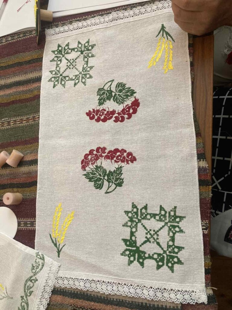 Учасники працювали зі спеціальними штампами, створювали орнаменти, підбирали кольорові поєднання та формували композиції, використовуючи традиційні українські мотиви. Особливий інтерес викликала техніка верхової вибійки, яка дозволяє створювати унікальні візерунки на тканині.