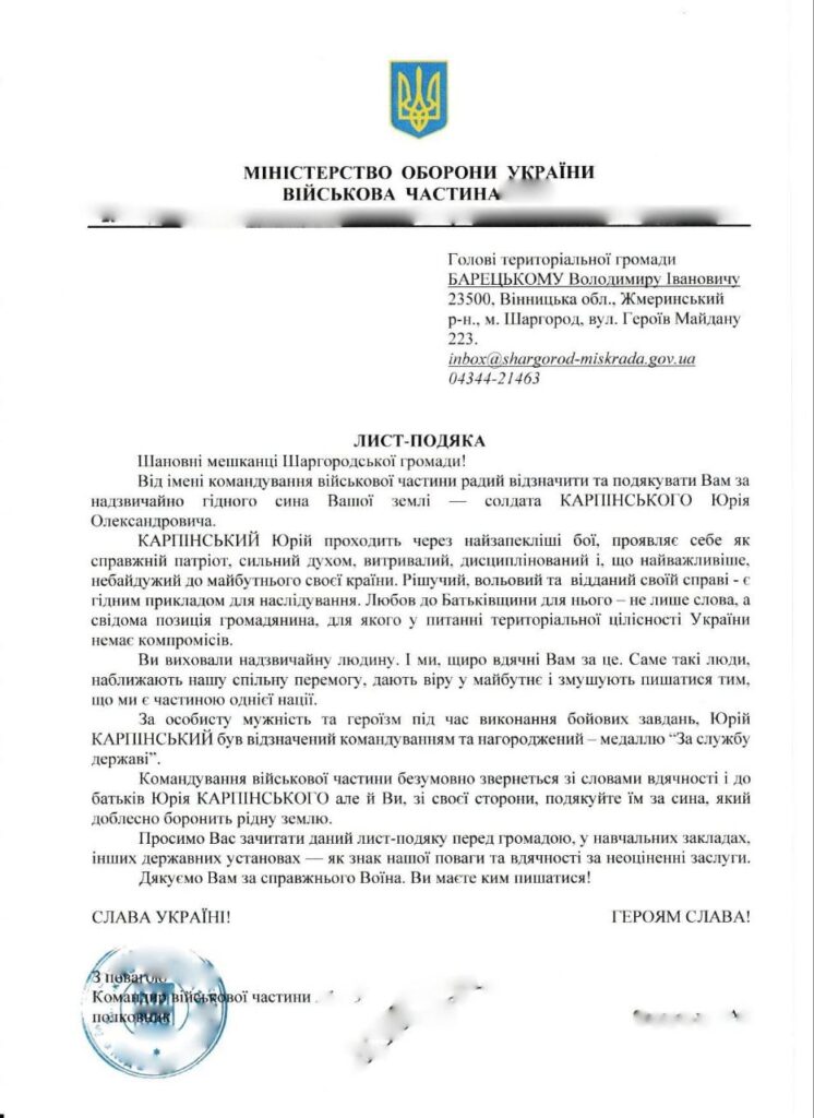 На Шаргородщину продовжують надходити Листи-Подяки від військових частин, у яких служать наші земляки. Чергове звернення надійшло щодо жителя села Політанки — солдата Юрія Карпінського.
